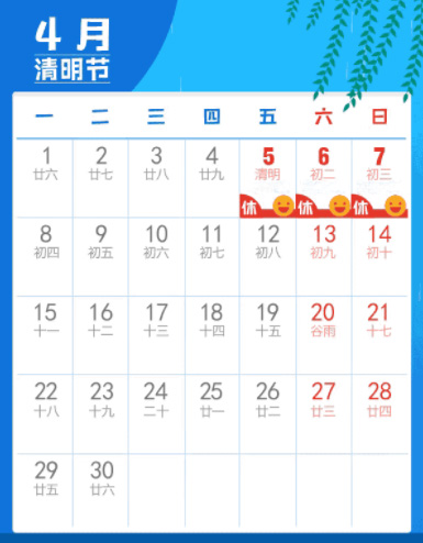 根據(jù)國務(wù)院關(guān)于2019年法定節(jié)假日放假安排,福建中凱檢測有限公司清明節(jié)放假安排通知如下:2019年清明節(jié)放假3天,即4月5日至4月7日放假,4月8日(周一)正常上班。